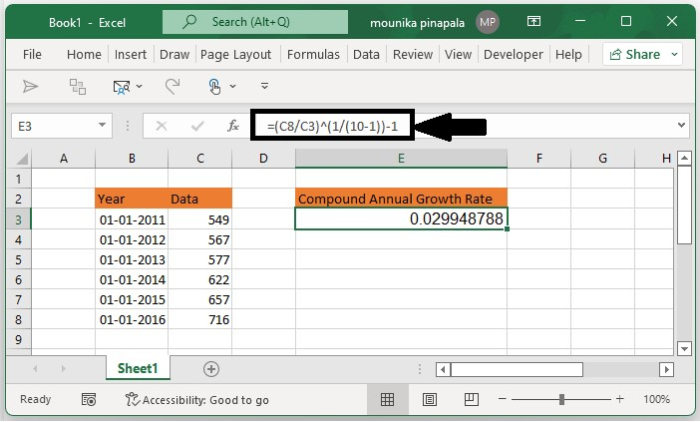 现在,您需要选择一个空白单元格,并将以下公式输入到空白单元格中,然后按Enter键,这样您就可以得到复合年增长率,如下面的屏幕截图所示。