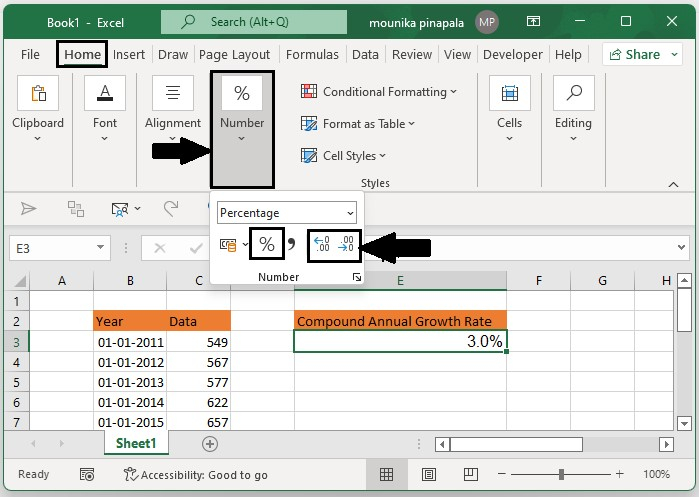 有时计算结果不会以百分比格式显示,为此,您需要选择结果单元格,然后单击“开始”选项卡上的“数字”下的百分比%图标,将获得的数字更改为百分比格式。然后,使用“增加小数位数”按钮或“减少小数位数”按钮更改其小数位数,如下面的屏幕截图所示。