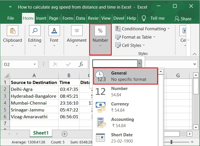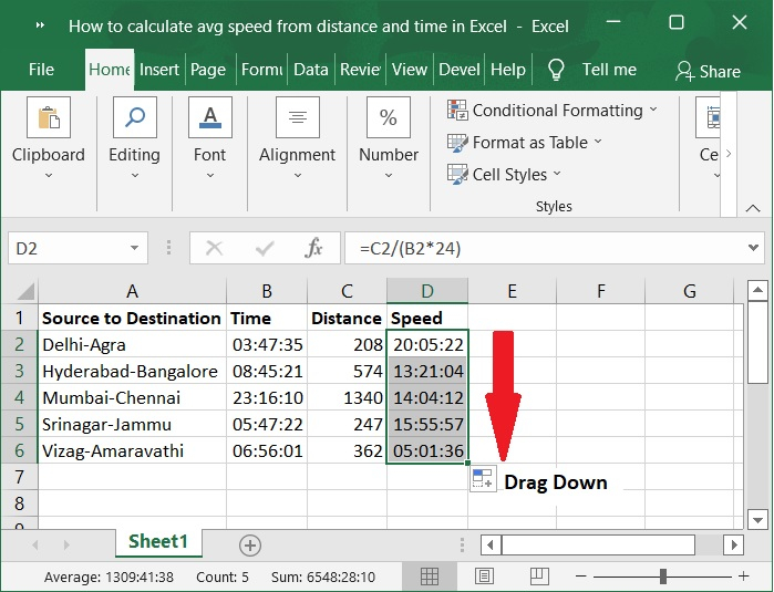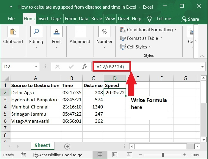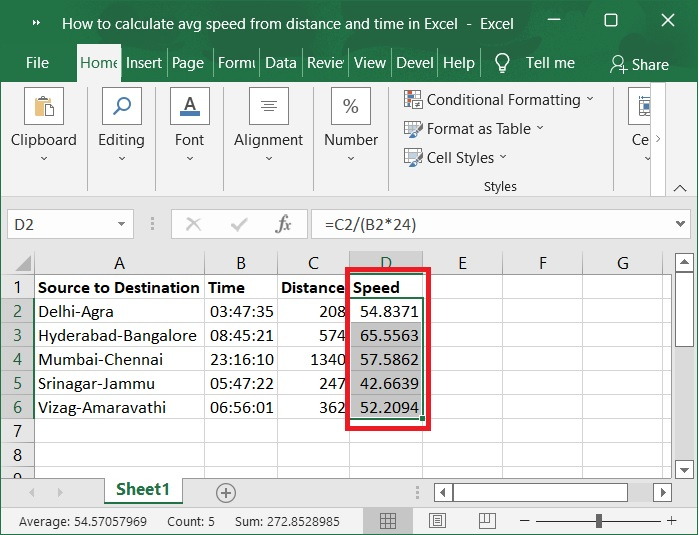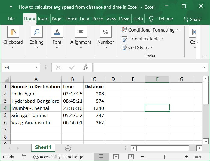 在第一步中,让我们假设我们有用于根据距离和时间计算平均速度的样本数据,如下面的屏幕截图所示。