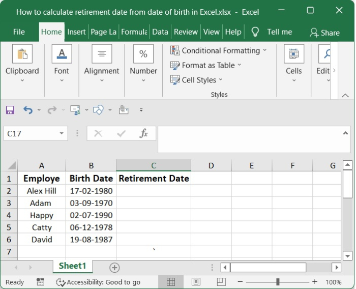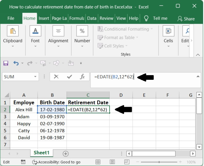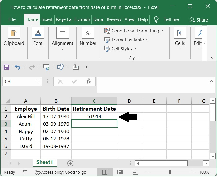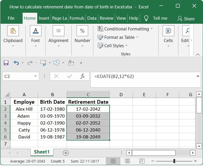 最后,您将获得显示基于出生日期的退休日期的日期。