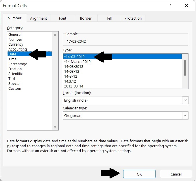 打开屏幕上显示的“设置单元格格式”窗口,在“数字”区域中选择“日期”,然后在“类型”选项中输入 *14-03-2012,最后单击“确定”按钮。