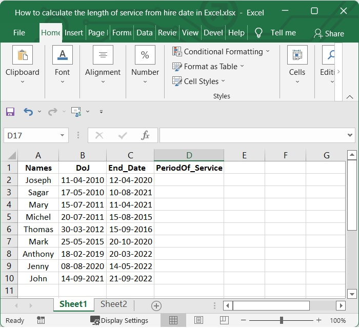 在我们的示例中,我们在Excel电子表格中有一些员工的姓名、入职日期和服务结束日期,如下面的图片所示。我们将计算服务期限。