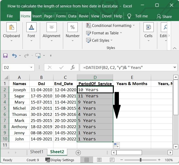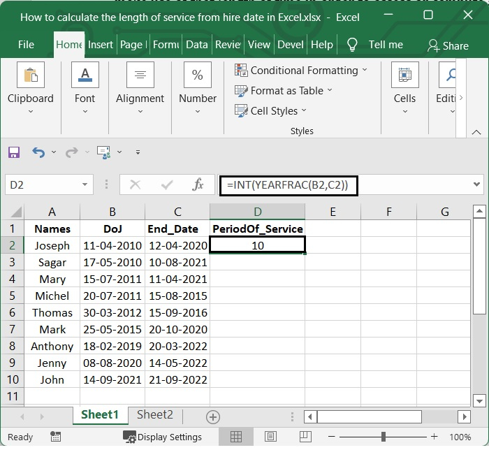 考虑到上面给出的示例,如果您想使用DATEDIF了解员工的服务期限,请将以下公式添加到一个空白单元格中。