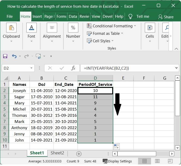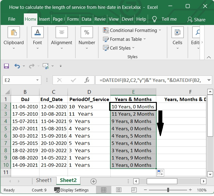 现在让我们了解如何使用Excel根据入职日期计算员工的服务期限。