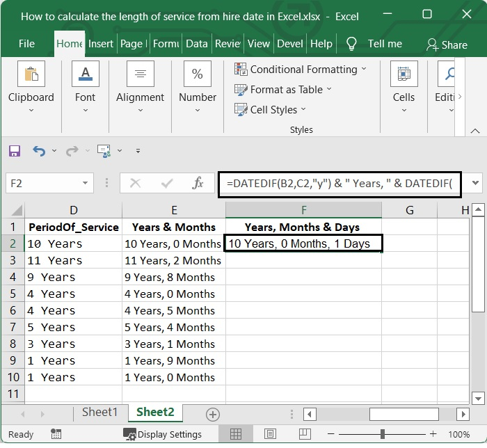 考虑到上面给出的示例,如果您想了解员工以年、月和日为单位的服务期限,请将以下公式添加到一个空白单元格中。
