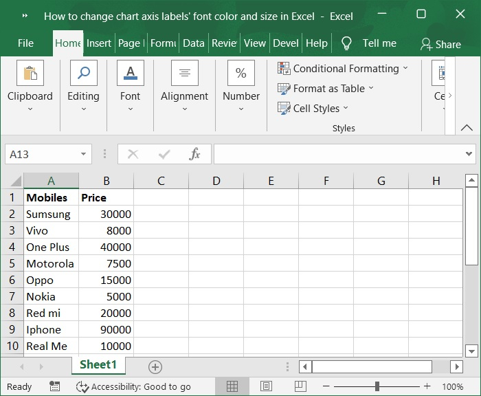 第一步,我们必须在 Excel 工作表中以列格式创建图表样本数据,如下面的屏幕截图所示。