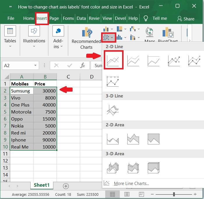 然后,选择 A1:B10 范围内的单元格。单击“插入”工具栏,然后选择“插入折线图或区域图 > 二维折线图”以显示上述样本数据的图形。如下面的屏幕截图所示。
