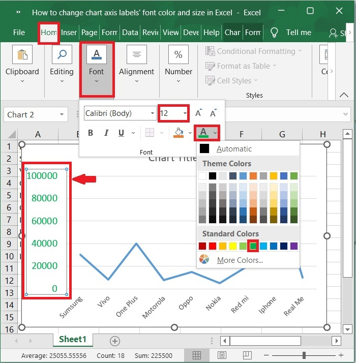 只需单击要更改图表中所有标签的字体颜色和大小的 y 轴,然后在“开始”选项卡上的“字体”组中,在“字体大小”框中键入字体大小,单击“字体颜色”按钮,然后从“字体”组中的下拉列表中选择字体颜色。这将更改图表中所有标签的字体颜色和大小。请参阅下面的屏幕截图。