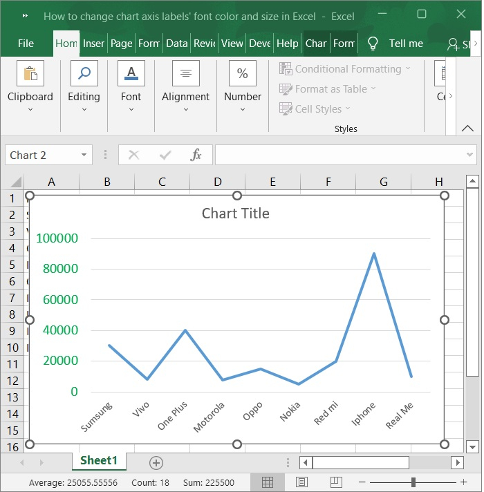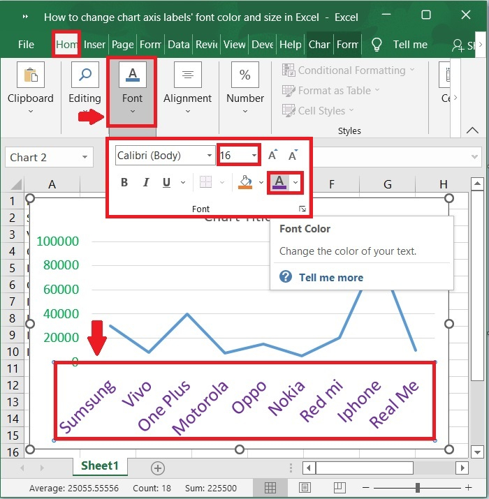 只需单击要更改图表中所有标签的字体颜色和大小的 x 轴,然后在“开始”选项卡上的“字体”组中,在“字体大小”框中键入字体大小,单击“字体颜色”按钮,然后从“字体”组中的下拉列表中选择字体颜色。这将更改图表中所有标签的字体颜色和大小。请参阅下面的屏幕截图。
