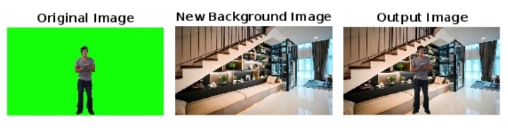 之后,我们将‘in_img’的绿屏背景替换为背景图像‘bg_img’。为了执行此替换,我们使用‘repmat’函数。结果然后存储在变量‘out_img’中。
