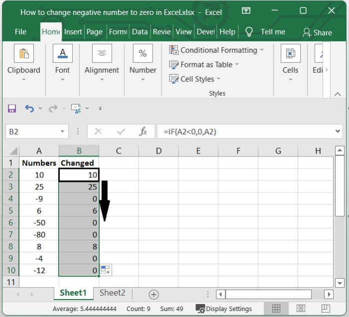 您可以选择要应用此公式的范围,方法是将填充柄拖动到所需位置。除此之外,每个负整数都被替换为零。