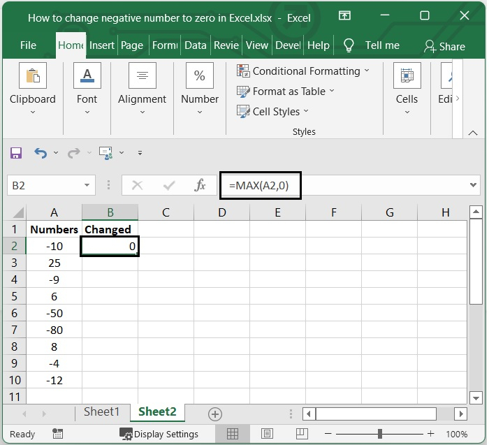 您可以使用一个基于 MAX 函数的公式将负整数转换为零,而不会影响正数。这可以通过使用以下公式来实现。