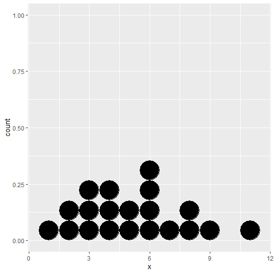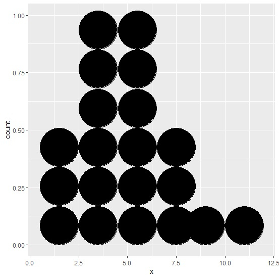 library(ggplot2) ggplot(df,aes(x))+geom_dotplot(binwidth=1)