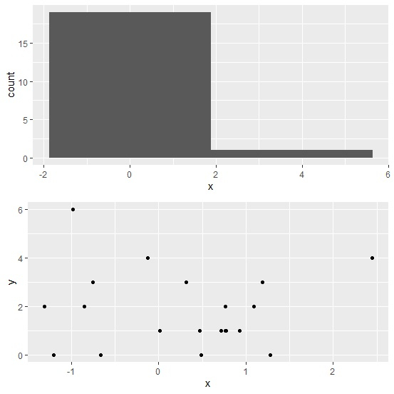 library(ggplot2) p1<-ggplot(df,aes(x))+geom_histogram(bins=2) p2<-ggplot(df,aes(x,y))+geom_point()