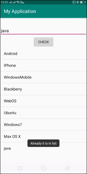 在上面的结果中,我们已将 元素 添加到 ListView中,现在输入 相同 的值以进行数据验证,如下所示 -