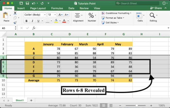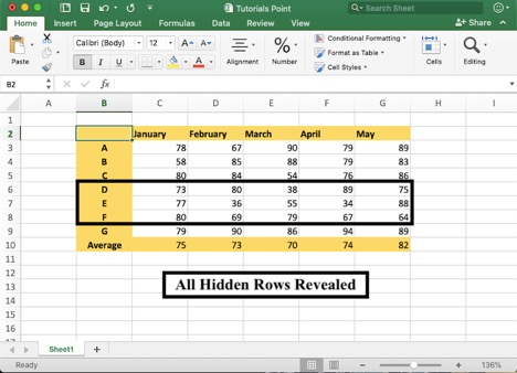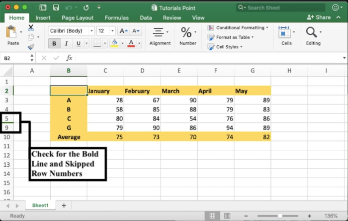 步骤 1 - 在行标题中检查是否有双线。隐藏的行以较粗的边框和跳过的编号标记。如您所见,在第 5 行之后是第 9 行,表示第 6 到第 8 行被隐藏。