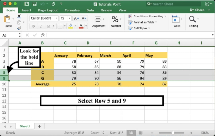 步骤 2 - 要取消隐藏行,请选择要显示的行上面和下面的行。在本例中,选择并按住第 5 行,按 Shift 键,然后选择第 9 行。