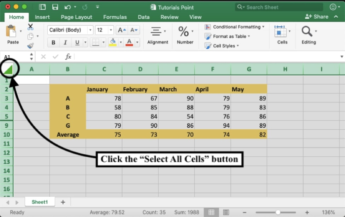 步骤 1 - 使用键盘快捷键 Ctrl+A 或单击电子表格的行和列标题之间的“全选”按钮来选择所有单元格。