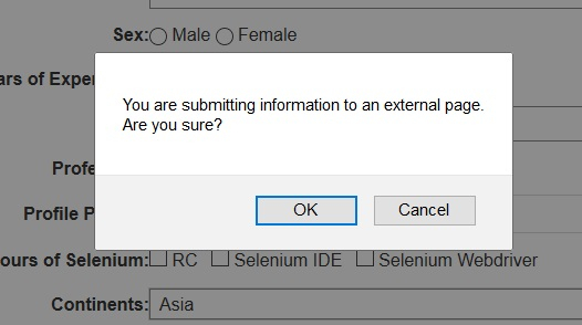 让我们考察一下下面的警示并检查它是否存在于页面上。有一个称为alertIsPresent的条件,我们将使用它来查看警示。它应等待特定时间来显示警示,在这段时间后它将引发异常。