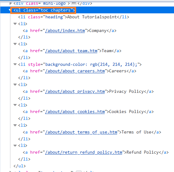 我们将要搜索的类名作为参数传递给该方法。让我们研究下面的 html 代码以了解具有类值 toc chapters 的 ul 元素。然后获取其子元素。