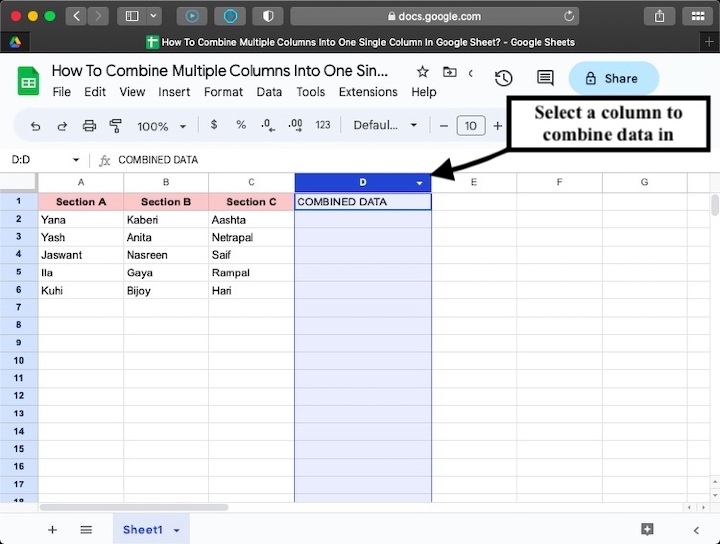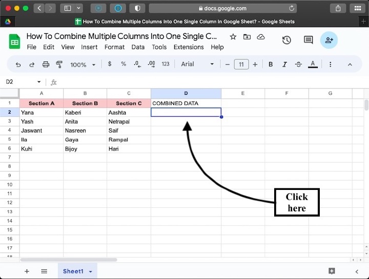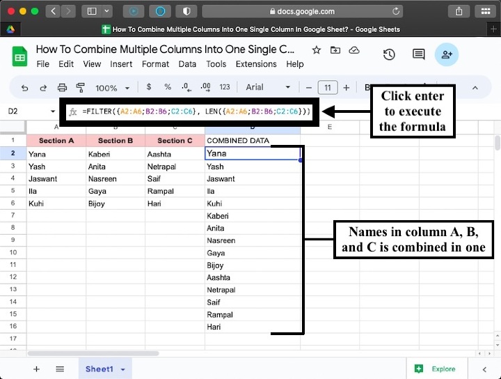将 A、B 和 C 列中的数据合并到 D 列中的单个列表中的 Google 表格公式:=FILTER({A2:A6;B2:B6;C2:C6}, LEN({A2:A6;B2:B6;C2:C6}))