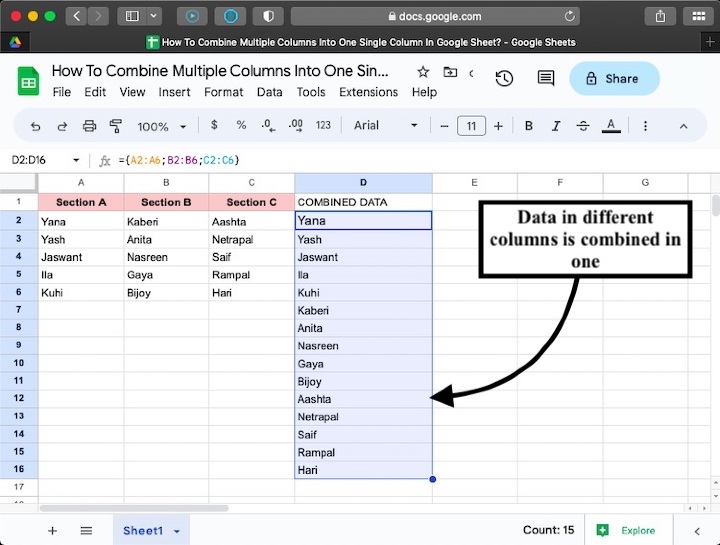 这是另一种更快、更简单的方法来在一列中排列数据。您可以使用带有分号分隔的单元格范围的数组公式来实现此目的。虽然可以使用各种分隔符来连接值,但分号 (;) 提供了一种独特且通用的方法,尤其是在处理基于文本的数据时。