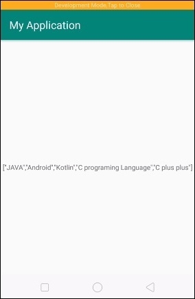 <?xml version = "1.0" encoding = "utf-8"?> <android.support.constraint.ConstraintLayout xmlns:android = "http://schemas.android.com/apk/res/android" xmlns:app = "http://schemas.android.com/apk/res-auto" xmlns:tools = "http://schemas.android.com/tools" android:layout_width = "match_parent" android:layout_height = "match_parent" tools:context = ".MainActivity"> <TextView android:id = "@+id/result" android:layout_width = "wrap_content" android:layout_height = "wrap_content" android:text = "Result Data" app:layout_constraintBottom_toBottomOf = "parent" app:layout_constraintLeft_toLeftOf = "parent" app:layout_constraintRight_toRightOf = "parent" app:layout_constraintTop_toTopOf = "parent" /> </android.support.constraint.ConstraintLayout>