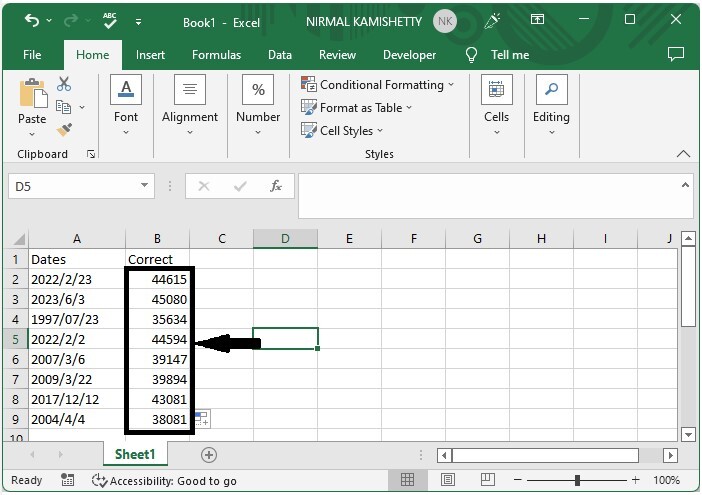 让我们考虑一个 Excel 工作表,其中工作表中的日期格式不正确,如下面的图像所示。