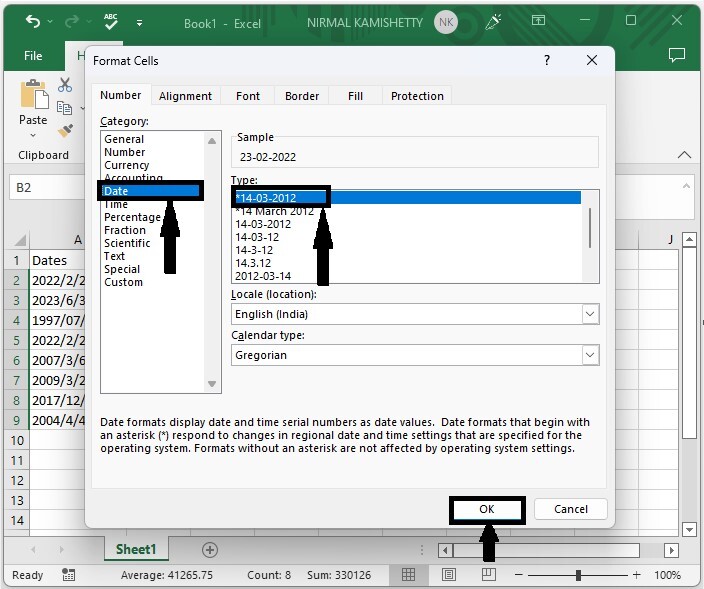 要将它们转换为日期格式,请选择这些值,然后右键单击并选择“设置单元格格式”;在弹出窗口中,单击“日期”并单击“确定”。