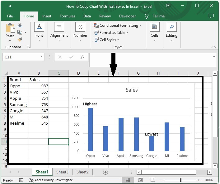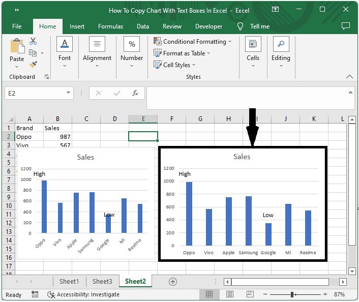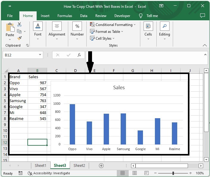 在这里,我们将通过按住 SHIFT 并单击“组合”来选择所有文本框以及图表。让我们来看一下在 Excel 中使用分组复制包含文本框的图表的简单过程。