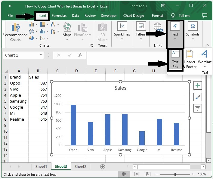 现在,在插入文本框之前,单击图表,然后单击“插入”下的文本框,并在图表上绘制图表框,如下面的图像所示。