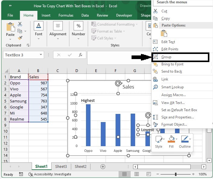现在按住 SHIFT 并单击图表,然后单击所有文本框并右键单击,然后选择“组合”,如下面的图像所示。