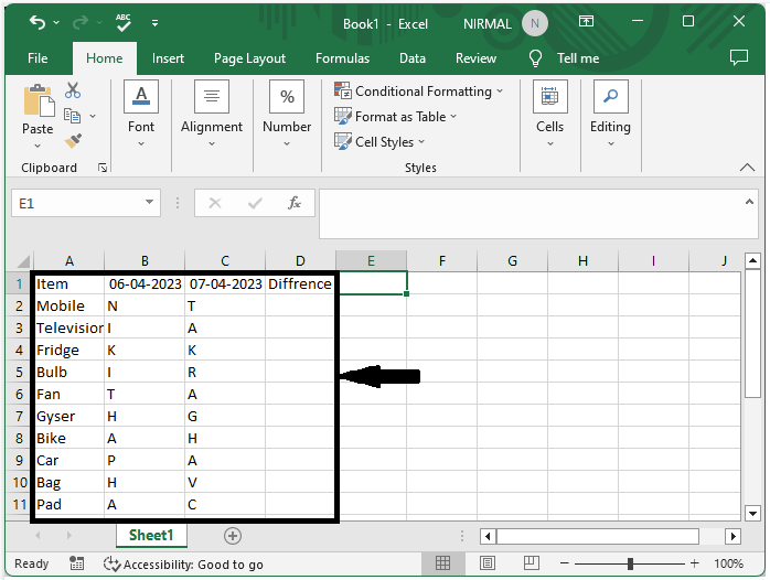 在这里,我们将首先使用公式获取其中一个值,然后使用自动填充柄完成任务。在本教程中,我们使用了一个简单的示例来演示如何在 Excel 中计算字母之间的差异。