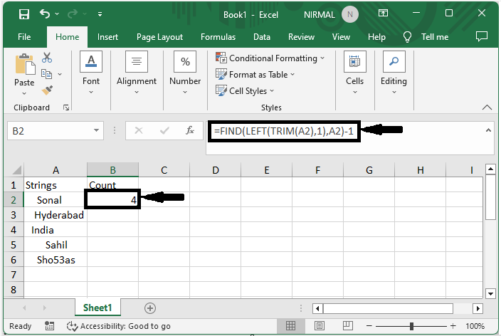 首先,要计算空格,请单击一个空单元格并输入公式 =FIND(LEFT(TRIM(A1),1),A1)-1,然后单击回车以获取第一个值。