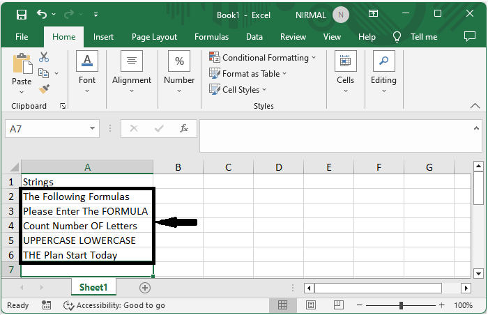 考虑一个 Excel 工作表,其中您有一系列包含大小写字符的字符串,类似于下图。