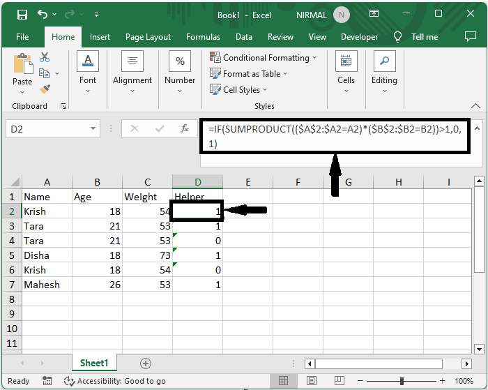 首先,在数据中添加一个名为“辅助”的新列,并输入公式 `=IF(SUMPRODUCT(($A$2:$A2=A2)*($B$2:$B2=B2))>1,0,1)`,然后按 Enter 键。然后使用自动填充柄向下拖动。