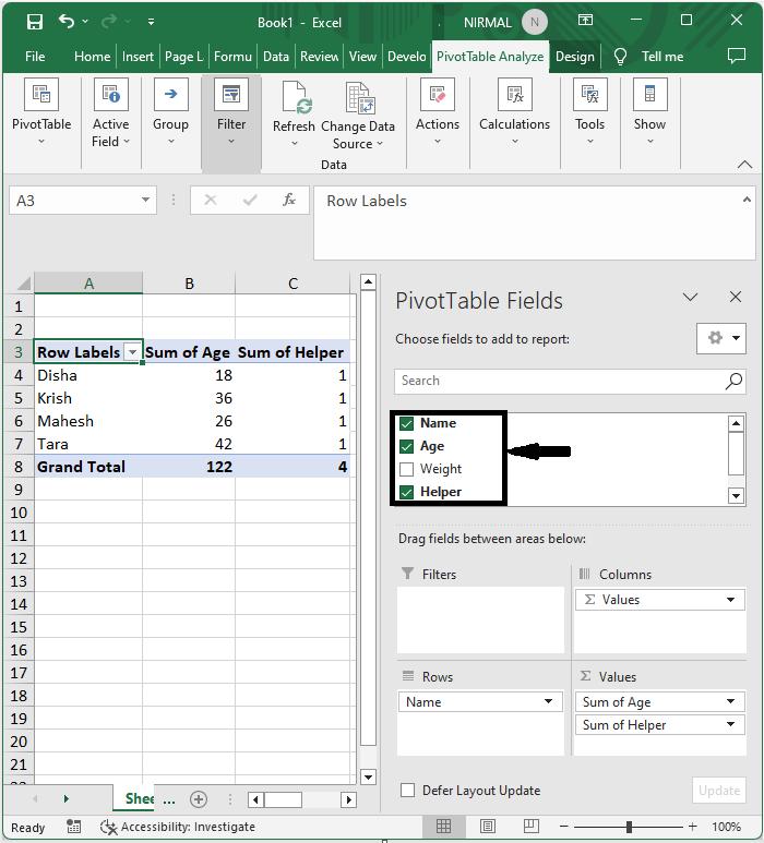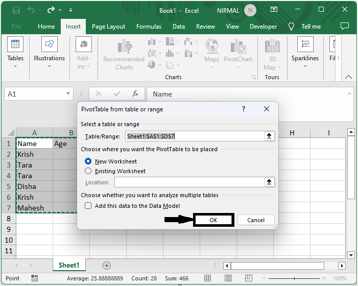 然后选择单元格范围,单击“插入”下的“数据透视表”,然后单击“确定”。