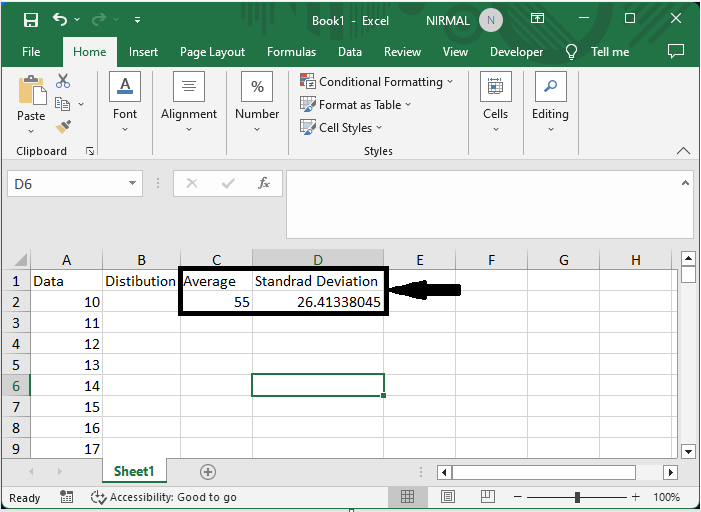 然后在单元格 C2 中,输入公式 =AVERAGE(A2:A92),在单元格 D2 中,输入公式 =STDEV(A2:A92),然后单击回车。