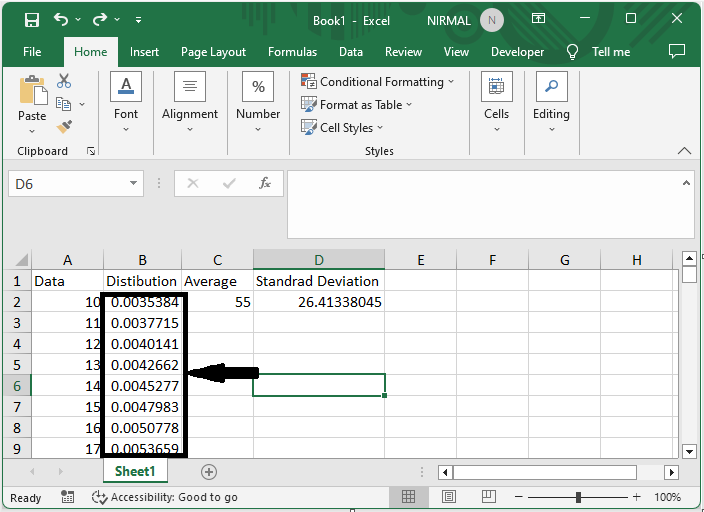 现在在单元格 B2 中,输入公式 =NORM.DIST(A2,$C$2,$D$2,FALSE) 并单击回车,然后使用自动填充柄向下拖动。
