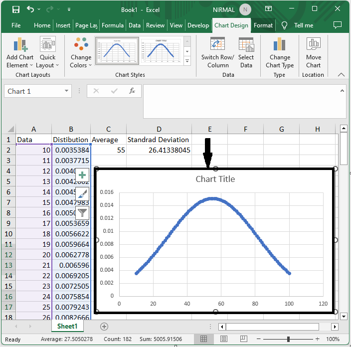 在这里,我们将首先准备数据,然后创建一个散点图,最后将工作表另存为模板以完成任务。因此,让我们看看一个简单的过程来学习如何在 Excel 中创建钟形曲线图表模板。
