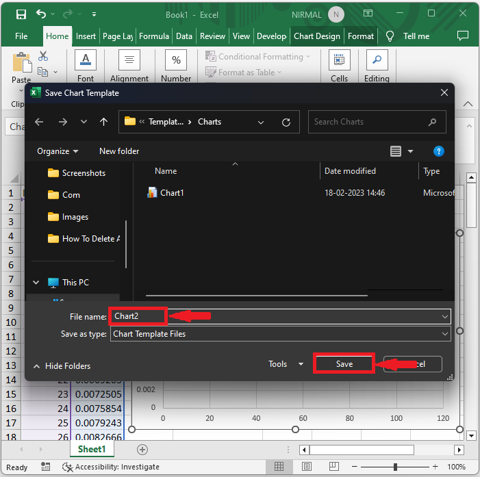 然后右键单击图表并选择“另存为模板”。然后输入名称,将“保存类型”设置为“Excel 模板”,然后单击“确定”。