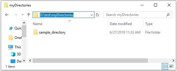 Enter the path to create a directory: D:\test\myDirectories\ Enter the name of the desired a directory: sample_directory Directory created successfully