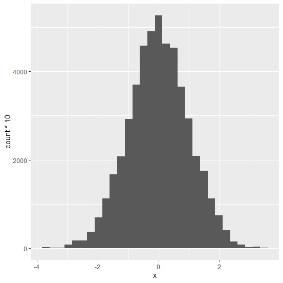 > df<-data.frame(x=rnorm(5000)) > library(ggplot2) > ggplot(df,aes(x))+geom_histogram(aes(y=..count..*10),bins=30)