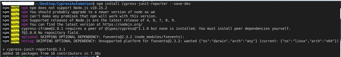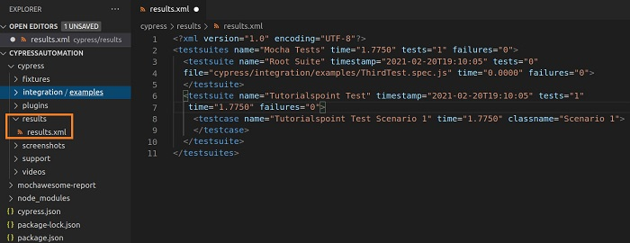 我们可以在 Cypress 中创建一个 Junit 报告。要安装用于 JUnit 报告的程序包,运行命令 −