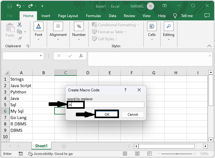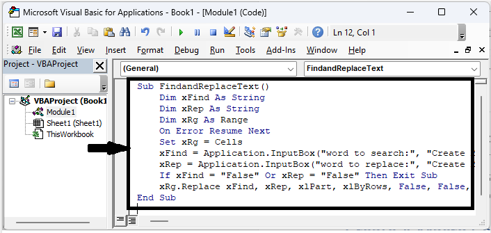 在这里,我们将首先创建一个 VBA 模块,然后运行它来完成任务。因此,让我们来看一个简单的过程,学习如何创建宏代码以在 Excel 中查找和替换文本。