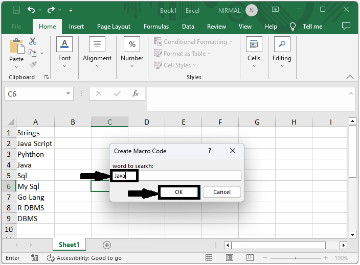 然后点击 F5 运行模块。然后在“查找文本”框中输入要查找的文本,然后点击“确定”。