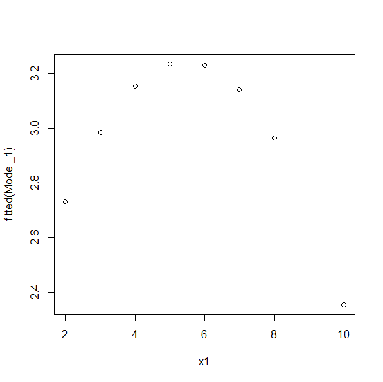 x1<-rpois(10,5) y1<-rpois(10,2) Model_1<-lm(y1~x1+I(x1^2)) plot(x1,fitted(Model_1))