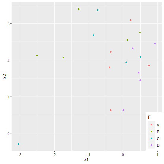 > ggplot(df, aes(x=x1, y=x2, colour=F)) + geom_point(aes(colour=F)) + + theme(legend.justification = c(1, 0), legend.position = c(1, 0))