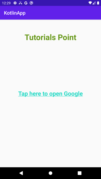 <?xml version="1.0" encoding="utf-8"?> <RelativeLayout xmlns:android="http://schemas.android.com/apk/res/android" xmlns:tools="http://schemas.android.com/tools" android:layout_width="match_parent" android:layout_height="match_parent" tools:context=".MainActivity"> <TextView android:layout_width="wrap_content" android:layout_height="wrap_content" android:layout_centerHorizontal="true" android:layout_marginTop="50dp" android:text="Tutorials Point" android:textAlignment="center" android:textColor="@android:color/holo_green_dark" android:textSize="32sp" android:textStyle="bold" /> <TextView android:id="@+id/textViewLink" android:layout_width="wrap_content" android:layout_height="wrap_content" android:layout_centerInParent="true" android:gravity="center" android:text="@string/messageWithLink" android:textSize="24sp" android:textStyle="bold" /> </RelativeLayout>