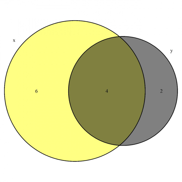 venn.diagram(list(x=1:10,y=7:12),fill=c("yellow","black"),